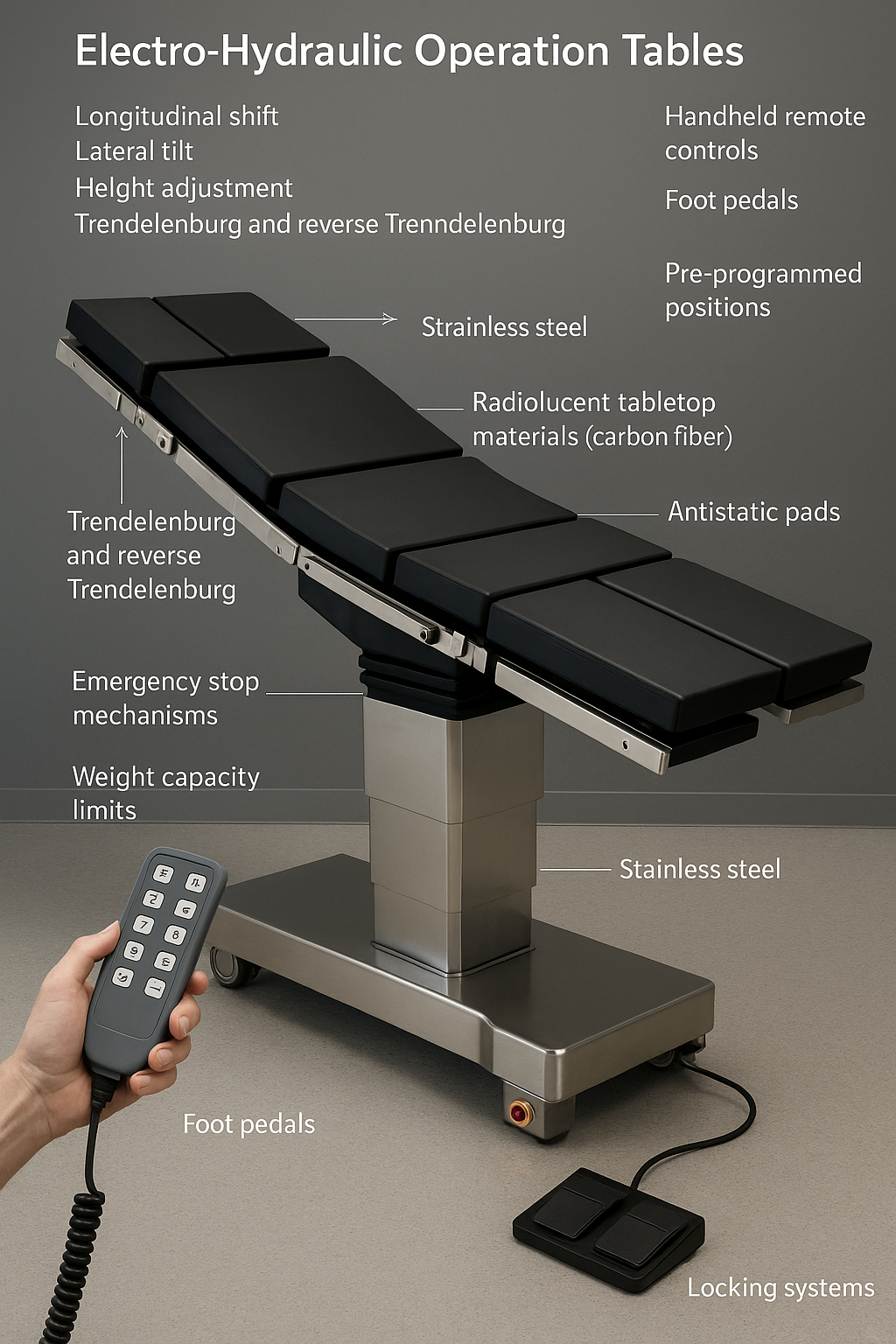 | উচ্চতা সামঞ্জস্য | রোগীর প্ল্যাটফর্ম বাড়ায় বা কমায় | সার্জনদের জন্য ergonomic অ্যাক্সেস প্রদান করে |